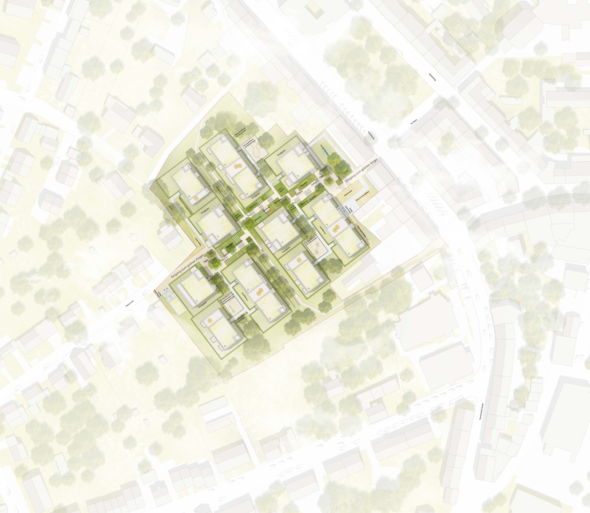 Zentrales Element des Entwurfes bildet ein Anger in Nord-Süd Richtung. Eine neue Wegverbindung vom südlichen Siedlungsgebiet beginnend von der städtischen Erich-Fried Gesamtschule bis zum Bandwirkerplatz bettet den Entwurf in seine Umgebung ein. Zwei Auftakt Plätze in Tal und Plateaulage bilden den Eingang in das Quartier. Dazwischen befindet sich der stark begrünte Anger. Großzügige Treppenanlagen mit Zugängen zu Sitzstufen und Terrassen laden zum Verweilen ein und bilden neben den Plätzen einen Ort des Aufenthalts und der Begegnung. Identitätsstiftendes Element des Ortes bleibt der Blick ins Zentrum von Ronsdorf, der auf unterschiedlichen Höhen inszeniert wird. Der städtebauliche Entwurf zeichnet sich durch eine aufgelockerte, offene Bebauung aus, die einen harmonischen Übergang zwischen dem Zentrum Ronsdorf zu dem kleinteiligeren Siedlungsgebiet im Süden formuliert. Die Bebauung ist parallel zum Hang angeordnet. Die Achse zum Bandwirkerplatz wird im Zusammenspiel mit der Architektur in drei Abschnitte gegliedert. Die versetzte Anordnung der Zeilen und Punkthäuser in Ost West Richtung richten den Blick sowohl auf das Quartier, als auch auf die Umgebung und schaffen so eine natürliche Einbettung in die umliegenden Nachbarschaften.